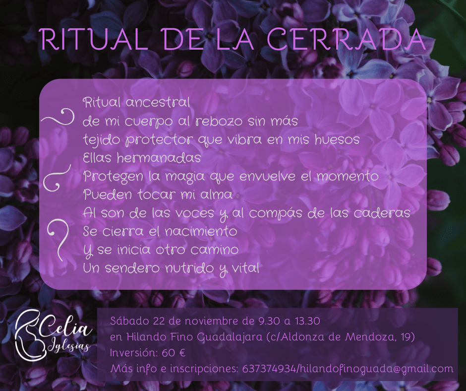 Sábado 22 de Noviembre de 09.30 a 13.30 En Hilando Fino Guadalajara (c/ Aldonza de Mendoza, 19) Inversión: 60 € Inscripciones: 637374934 o hilandofinoguada@gmail.com